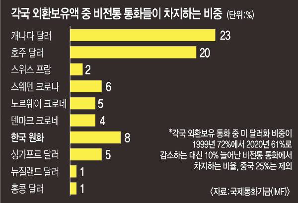 중국 위안화 역시 기축통화인 미 달러화의 빈자리를 대부분 차지할 것이란 예상과 달리 공백을 25% 메우는 데 그치고, 75%의 공백을 변방의 통화들이 메우고 있다는 점이다. 각국이 보유한 이들 통화는 1999년까지만 해도 300억 달러로 무시할 만한 비중에 그쳤으나 지난해 말 1조2000억 달러 상당으로 뛰어오르며 보유비중도 10%까지 늘었다.