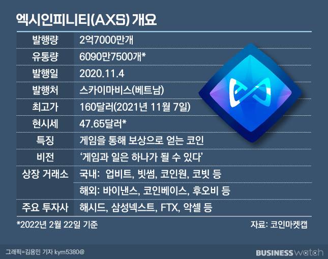 엑시인피니티는 베트남 게임 기업 스카이마비스가 개발한 동명의 블록체인 게임 '엑시인피니티(2018년 출시)'를 기반으로 합니다. 코인 중에서도 꽤 연식이 있습니다. 대체불가능토큰(NFT) 시장의 시초격 '크립토펑크(CryptoPunk)'가 2017년에 선보인 이후 1년 후에 엑시인피니티가 등장했습니다. '이더리움 1세대 P2E(Play to Earn) 게임'이라 불리는 이유이기도 하죠.