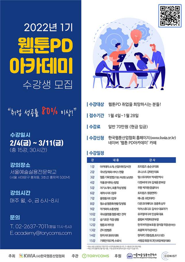 사단법인 한국웹툰산업협회(회장 서범강)가 주최하고 토리컴즈(대표 송순규)가 주관하며 코니스트(대표 강태진)와 서울예술실용전문학교(이사장 장승원)에서 후원하는 ‘2022 웹툰 PD 아카데미’가 오는 2월 7일 서울예술실용전문학교(홍제동)에서 열린다.