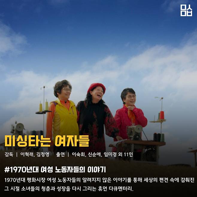 ‘미싱타는 여자들’은 여자라서 혹은 가난하다는 이유로 공부 대신 미싱을 탈 수밖에 없었던 1970년대 평화시장 여성 노동자들의 알려지지 않은 이야기를 통해 세상의 편견 속에 감춰진 그 시절 소녀들의 청춘과 성장을 다시 그리는 휴먼 다큐멘터리.영화 ‘미싱타는 여자들’은 1970년 전태일 열사 분신 이후 결성된 평화시장 청계피복노동조합 속 여성 노동자들의 이야기를 심층적으로 다룬 작품이다. 가정 환경 혹은 시대적 흐름 때문에 미싱사가 될 수밖에 없었던 10대의 소녀들에게 ‘노동 교실’은 꿈의 공간이었다. 영화는 그들이 배우고 성장할 수 있었던 ‘노동 교실’에 얽힌 아픔과 청춘, 그리고 그곳을 지키고자 했던 저항의 순간부터 오늘날의 기록까지 당시의 인물들을 통해 이야기하고 있다. 단순히 노동의 역사가 아닌 스스로의 존엄을 위해 노력했던 여성들의 이야기를 그린 ‘미싱타는 여자들’은 그 시절을 함께 지나온 당사자들의 인터뷰와 더불어, 당시의 사진과 편지를 직접 보고 낭독하는 등 다양한 방식으로 여성 노동자들의 젊은 날의 초상을 다시 그려낸다.