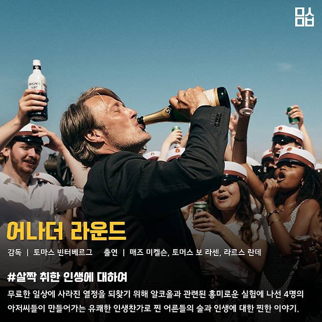 ‘어나더 라운드’는 무료한 일상에 사라진 열정을 되찾기 위해 알코올과 관련된 흥미로운 실험에 나선 4명의 아저씨들이 만들어가는 유쾌한 인생찬가로 찐 어른들의 술과 인생에 대한 찐한 이야기.‘모든 인간은 혈중 알코올 0.05%(0.5g/ml)의 농도를 가지고 태어난다. 매일 이를 유지하면 창의적으로도, 용감하게도 만든다’라는 이론을 직접 실천하는 아저씨들의 진지하면서도 귀엽고 짠하기까지 한 활약이 관객들을 사로잡는다. 미국의 비평 사이트 로튼 토마토 전문가 평점인 신선도 92%를 기록하고 관객 점수인 팝콘 지수 91%로 완성도는 물론 대중적인 재미까지 인정 받았다. 국경을 초월한 만국 공통의 음주 문화에 대한 공감으로 일찌감치 레오나르도 디카프리오의 영화사 애피언 웨이에서 할리우드 리메이크 제작을 확정해 화제를 모았다. 영화에는 세계적인 배우 매즈 미켈슨의 열연과 토마스 보 라센, 라르스 란데, 마그누스 밀랑까지 연기 경력 20년 이상의 베테랑 배우들이 출연하여 실제를 방불케 하는 실감나는 상황들로 관객들을 사로잡는다.