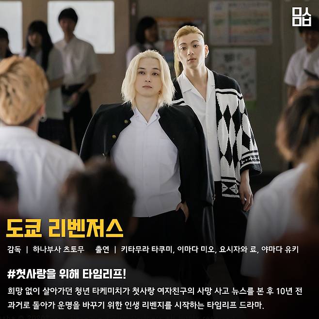 ‘도쿄 리벤저스’는 희망 없이 살아가던 청년 타케미치가 첫사랑 여자친구의 사망 사고 뉴스를 본 후 10년 전 과거로 돌아가 운명을 바꾸기 위한 인생 리벤지를 시작하는 타임리프 드라마.기대 없는 매일매일을 살아가는 20대 청년 타케미치는 어느 날 뉴스를 통해 첫사랑 여자친구가 사고로 사망했다는 소식을 듣게 된다. 유일하게 자신을 있는 그대로 믿어주었던 그녀를 떠올리던 타케미치는 특별한 타임리프를 통해 10년 전 고등학교 시절로 돌아가게 되고 그녀를 살리고 운명을 바꾸기 위해서는 자신이 변해야만 한다는 걸 깨닫게 된다. 영화 ‘도쿄 리벤저스’는 2017년 3월부터 연재를 시작한 『도쿄 리벤저스』(작가: 와쿠이 켄)를 원작으로 하고 있다. 원작 만화는 개성 넘치는 캐릭터들과 탄탄한 스토리로 뜨거운 인기를 얻으며 현지에서 TV애니메이션으로 방영되었고, 국내를 비롯 아시아 국가들과 북미에서도 방영되며 인기를 모았다. 이러한 관심 속에 실사 영화로 탄생한 ‘도쿄 리벤저스’는 일본 대표 배우 키타무라 타쿠미를 필두로, 일본에서 가장 핫한 라이징 스타들이 총 출동해 높은 싱크로율과 몰입력으로 흥행에 성공했다. 그 결과 2021년 일본 개봉 실사 영화 흥행 수입 1위를 기록했다.