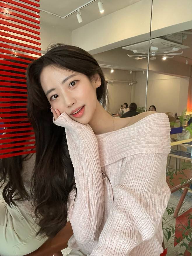 넓은 오프숄더 니트는 어깨라인을 자연스럽게 노출해주어