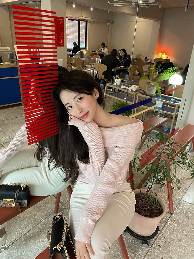 넓은 오프숄더 니트는 어깨라인을 자연스럽게 노출해주어