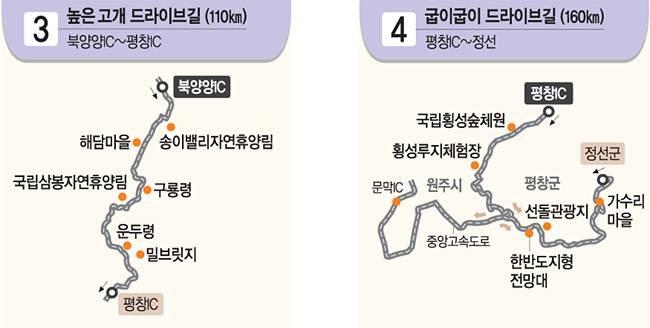 영동고속도로 평창IC에서 시작해 횡성을 거쳐 영월로 그리고 정선으로 향하는 코스다. 평창IC~국립횡성숲체원~안흥찐빵마을~젊은달 와이파크~청령포~동강 가수리마을~정선읍으로 이어진다. 영월에서 원주로 이어지는 갈래길도 있다. 갈래길을 택하면 원주의 용소막성당과 반계리 은행나무 등을 들를 수 있다. 잔도(棧道)와 전망대 등 다양한 시설이 새로 들어선 소금산 그랜드밸리를 빼놓지 말자.