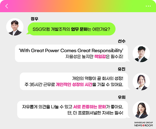 이야기를 나누다 보니 이렇게 중요한 역할을 수행하는 개발조직의 실제 업무 문화가 궁금해졌습니다. 아무래도 세 분은 스마일 에이전트의 핵심(!) 요원이신 만큼, SSG닷컴 개발조직의 업무 문화와 환경에 대해 더 잘 말씀해주셨는데요. 선수님은 영화 ‘스파이더맨’의 명대사를 인용해 SSG닷컴 개발조직 문화를 설명해주셨습니다. 한마디로 ‘With great power comes great responsibility(큰 힘에는 큰 책임이 따른다)’입니다. SSG닷컴 개발조직은 직급/연차에 상관없이 자율성이 높습니다. 대신 그에 따른 업무에 대한 책임감은 필수입니다.