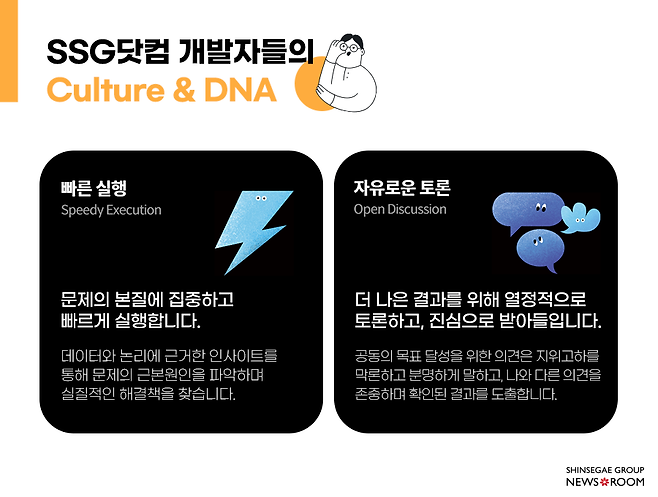 이제는 업계를 막론하고 세간의 주목을 받고 있는 ‘개발자들’. 이쯤 되니 궁금해집니다. IT 업계의 ‘꽃’ 개발자들은 어떻게 일하고 있을까요? 사실 멀리갈 필요는 없습니다. 신세계그룹에도 대표적인 이커머스 회사가 있습니다. 바로 SSG닷컴이죠. 우리 SSG닷컴의 개발조직은 어떻게 일하고 있을까요? SSG닷컴 개발조직을 대표하는 ‘스마일 에이전트’*에서 활약 중인 세 파트너를 만나 이야기 들어봤습니다.