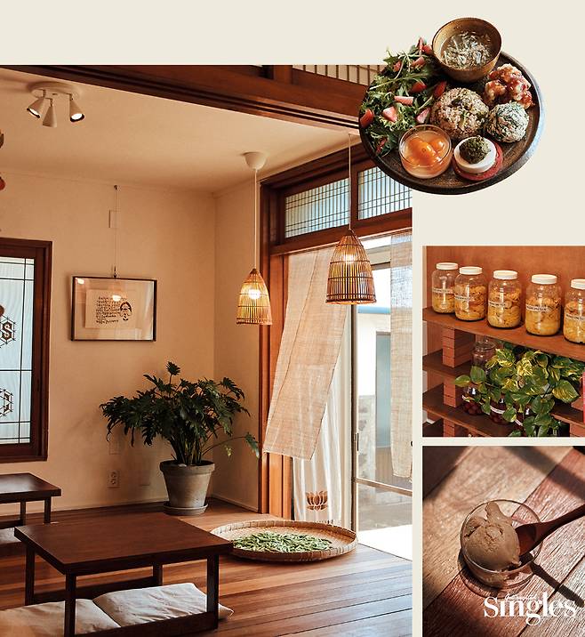 그 계절에만 먹을 수 있는 건강한 채소가 있다. 산토샤는 비건 발효 채식을 경험할 수 있는 채소 요리 공간으로 절기에 따라 채소 정식을 구성한다. 직접 발아시킨 유기농 현미로 지은 밥과 4가지 정도의 요리, 잎채소 샐러드, 수프 또는 국을 제주 옹기 접시에 담아 낸다. “산토샤는 산스크리트어로 수용과 만족을 뜻합니다. 한그릇의 채소 요리로도 충만한 시간이길 바라며 음식을 준비하죠.” 김아영 대표는 절기마다 가장 맛있는 채소를 구하기 위해 새벽의 곶자왈에서 쑥을 따오기도 하고, 오일장이나 유기농 전문 마트에도 간다. 이렇게 찾은 지역의 유기농 식재료에 제주 푸른콩장을 더해 맛을 낸다. “콩고기나 대체육을 비롯한 가공식품과 화학조미료를 쓰지 않고 직접 발효한 채소로 원재료의 맛을 극대화하려고 애쓰고 있어요.” 산토샤는 일부러 느린 음악을 틀어놓는다. 천천히 음식을 먹는 행위를 알아차리는 순간을 경험하도록 하기 위함이다. 시즌제를 통해 새로운 채소 요리를 선보이고 싶다는 김 대표는 올겨울엔 공부를 하러 훌쩍 떠났다 다시 돌아와 산토샤 시즌2를 이어갈 예정이다.