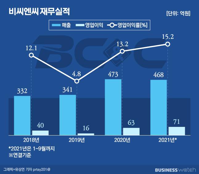 비씨엔씨는 반도체 제조 핵심부품 ‘쿼츠’ 생산업체다. 2021년 1~9월 연결매출 468억원을 기록했다. 삼성전자 및 SK하이닉스 비중이 53.8%(252억원)다. 영업이익은 71억원을 나타냈다. 이익률은 15.2%다.