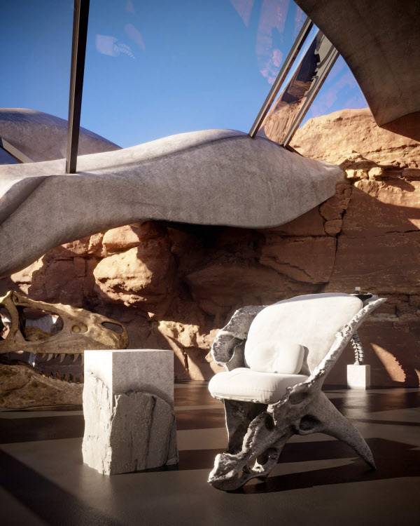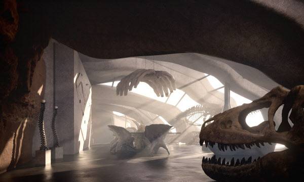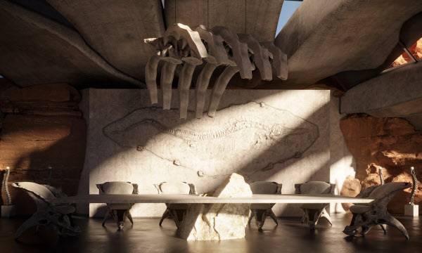 건물을 구성하는 뼈 모양 구조물은 철근 콘크리트 재질이다. 뼈 모양 구조물 사이에 빈 공간은 유리로 마감했다. 내부 인테리어는 바위로 만든 테이블과 의자, 공룡 뼈 모양을 모티브로 한 샹들리에와 촛대 등 다양한 오브제들이 전시될 예정이다.