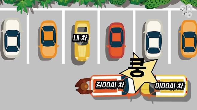 가령 이런 건데 아파트 주차장에서 내 차를 뺄려고보니 이중주차된 김00씨 차가 있었다고 치자. ‘뭐야 이거~’ 싶어서 김00씨 차를 밀었는데 재수가 없었는지 이00씨 차와 부딪혀버린 거다.
