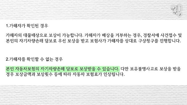 그럼 보험금도 받을 수 있으니 고민해결?이 아니라 정작 중요한 게 빠졌다. 가해자를 찾았다면 가해자의 보험사가 변상하겠지만 가해자를 찾지 못하고 보험 처리하면 내 차 보험료가 오르는 게 문제다.