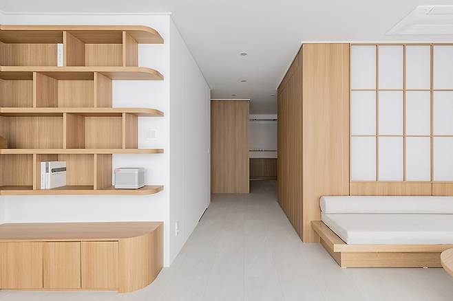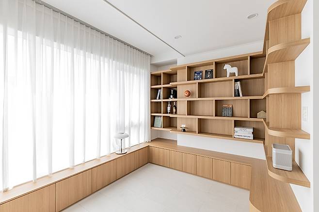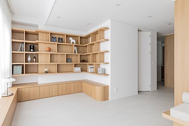 그리고 주방 TV월에서 복도, 거실까지 연결된 우드 톤이 따뜻한 인상을 자아내며 앞으로 펼쳐질 공간에 대한 기대감을 높이도록 했어요. 소파 공간 반대편은 책 선반 겸 디스플레이 공간입니다.