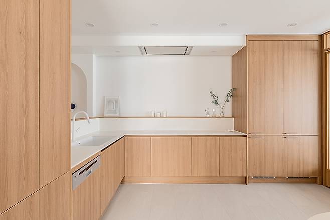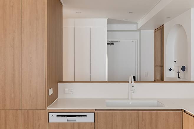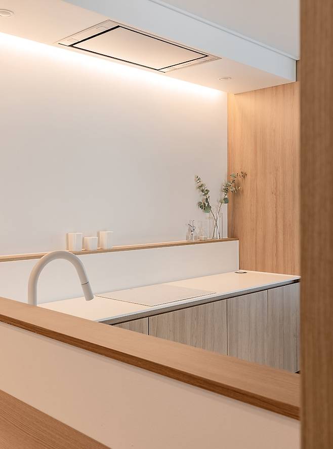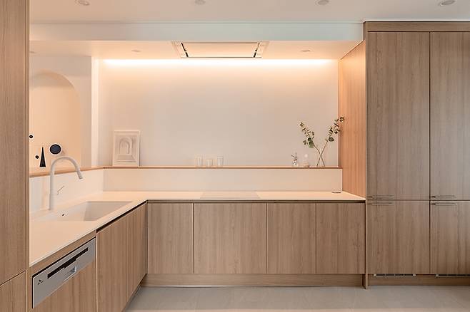 주방은 군더더기를 제거하고 최소한의 필요 기능만 남겨 본질에 집중할 수 있도록 설계하였는데요. 여백의 미가 느껴지는 편안한 무드를 연출했습니다.