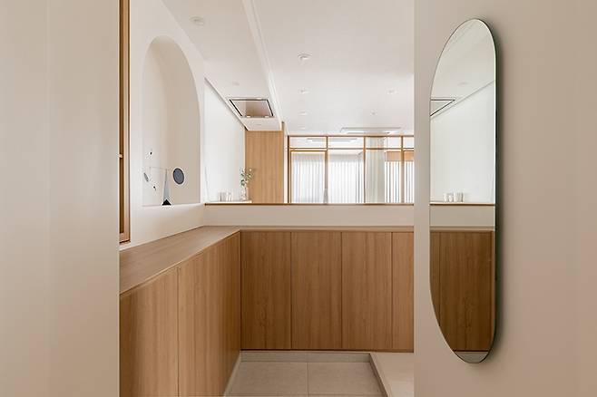 현관입니다. 현관 앞에 있던 비내력벽을 철거해 주방까지 개방감 있는 시야 확보하였어요. 그리고 가벼운 하프 파티션만 세워 주방과 자연스럽게 시선이 연결되도록 했습니다.