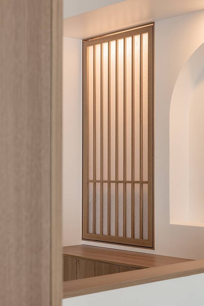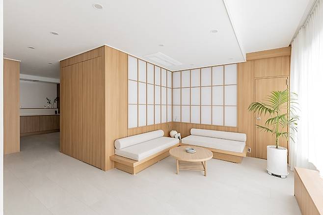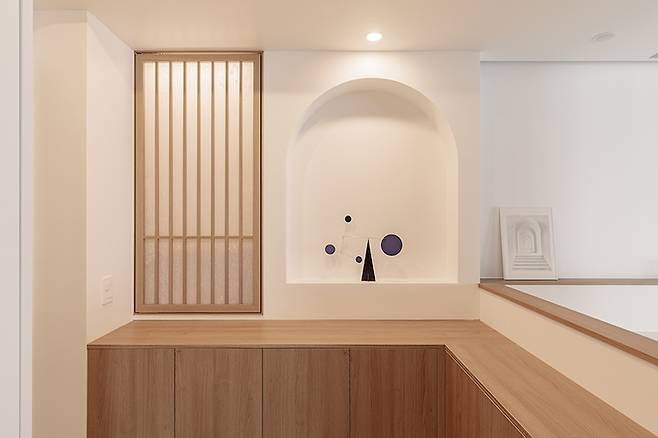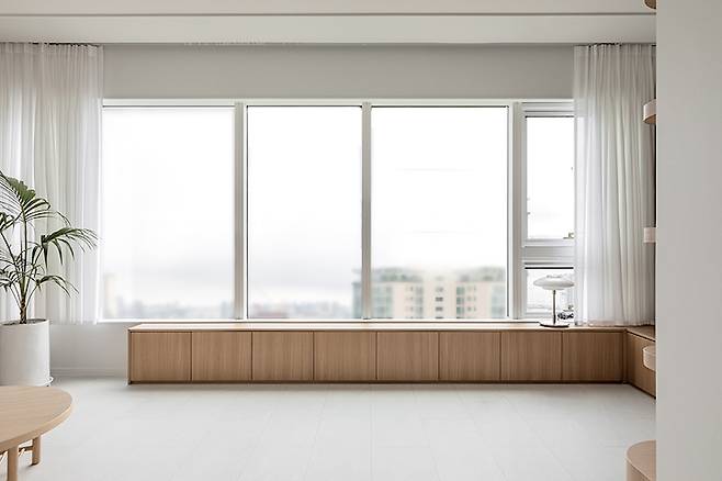 거실은 우드 톤을 주조로 통일감 있게 꾸몄는데요. 젠 스타일을 바탕으로 한 안락하고 담백한 감성이 감돌아요. 자체 제작한 붙박이 소파를 배치하고 그 뒤에 격자창의 포인트 월을 구성하였습니다. 내부에 간접조명을 넣어 조명의 역할까지 할 수 있도록 했어요.