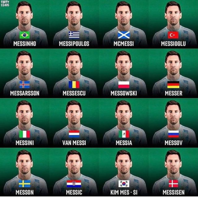 게시글에는 브라질, 독일, 이탈리아, 네덜란드 등 축구 강국으로 유명한 나라들과 터키, 폴란드, 그리스, 덴마크처럼 특이한 이름을 가진 선수들이 많은 나라들을 포함해 총 16개 국가가 있었다. ‘브라질리언’ 메시의 이름은 메시뉴, 이탈리아인 메시는 메시니, 네덜란드 출신의 메시는 반 메시 등 그 나라의 선수들이 많이 갖고 있는 이름을 메시에게 적용했다.
