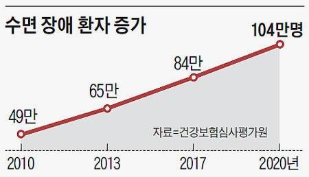 수면장애 환자가 크게 늘고 있다. 인구 고령화와 밤에도 뭔가를 하는 일상 탓이다. 수면장애 환자는 2010년 49만명이던 것이, 2020년에는 104만명으로 늘었다(건강보험심사평가원 통계). 10년 사이 두 배가 됐다.