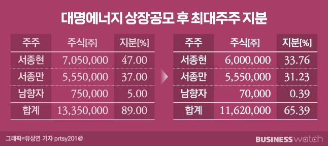 대명에너지는 상장후 서종현 대표가 1대주주로서 지분 33.76%를 소유하게 된다. 하지만 동생 서종만 이사의 지분 역시 31.23%나 된다. 이외 모친 남향자씨(0.39%) 등 일가 합산 65.39%다. 따라서 대명GEC 또한 형제가 지분을 엇비슷하게 공동 보유함으로써 양대 주력사간 교차소유가 이뤄질 것이란 뜻이다.