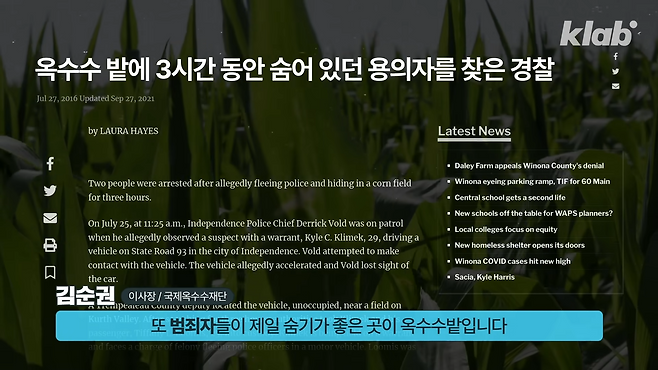 옥수수밭에서 숨어 있는 용의자를 찾았다는 기사도 볼 수 있어요.