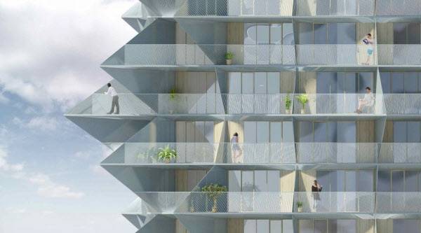 이 건물에서 가장 독특한 점은 층마다 가시가 돋친 듯한 모습을 한 발코니가 들어선다는 것. 발코니가 육각형 모양으로 보이게 하면서 층마다 무게중심을 맞추기 위해 외벽 일부는 바깥으로 뻗어나가며 동시에 일부는 안쪽으로 파여 있다. 이를 통해 불규칙적이면서 입체감을 갖춘 발코니와 테라스 배열이 가능했다.