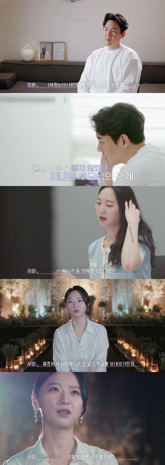 정환, 사랑 부부의 이야기도 이어졌다. 정환은 “저도 안 싸우고 싶어서 정신과 가서 신경안정제를 처방받아 먹고 있다”라고 고백한 후, 결혼 초부터 아내와 부모님 사이에서 갈등이 있었다고 전했다. 자신이 부모님에게 금전적인 도움을 받은 상황에서 고부 갈등까지 해결해야 하니 나름의 답답한 상황이 이어졌던 것. 사랑은 이와 관련해 제사가 1년에 6~7번 있고 결혼 후 시어머니가 자신을 요리학교에 보내는 등의 부담으로 인해 강박관념이 생겨 결혼 초부터 힘든 시간을 보냈다고 전했다.