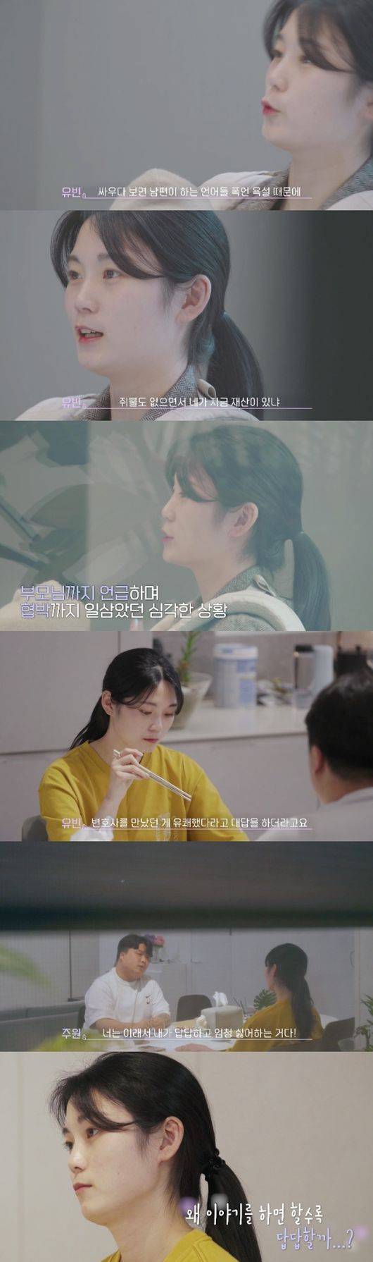 주원, 유빈 부부는 폭언에 대한 이야기로 충격을 안겼다. 유빈은 “싸우다 보면 남편이 하는 언어들, 폭언, 욕설 때문에 힘들어서 이혼을 고민하게 됐다”라고 말한 후 “남편은 ‘네가 이혼을 할 수 있을 것 같냐? 쥐뿔도 없으면서. 가진 게 있냐. 재산이 있냐’라고 하더라. ‘너희 부모님까지 잘 살게 두지 않을 것이다. 찾아가서 협박을 할 것이다’ 이런 식으로 이야기했다”라며 자신 외에 가족들에게까지 쏟아진 폭언을 고백했다. 유빈은 변호사와 상담 이후 아이와 둘이 살 집을 알아보러 다녔고 금전적인 부분과 집의 환경에서 현실의 벽에 부딪히게 되었다.