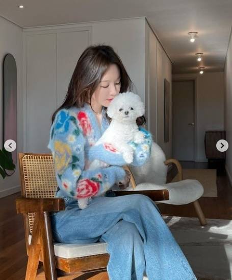 카디건과 청바지를 착용한 강민경은 반려견 휴지와 여유를 즐기고 있는 모습. 한남동 집의 감각적인 인테리어가 눈길을 사로잡는다.
