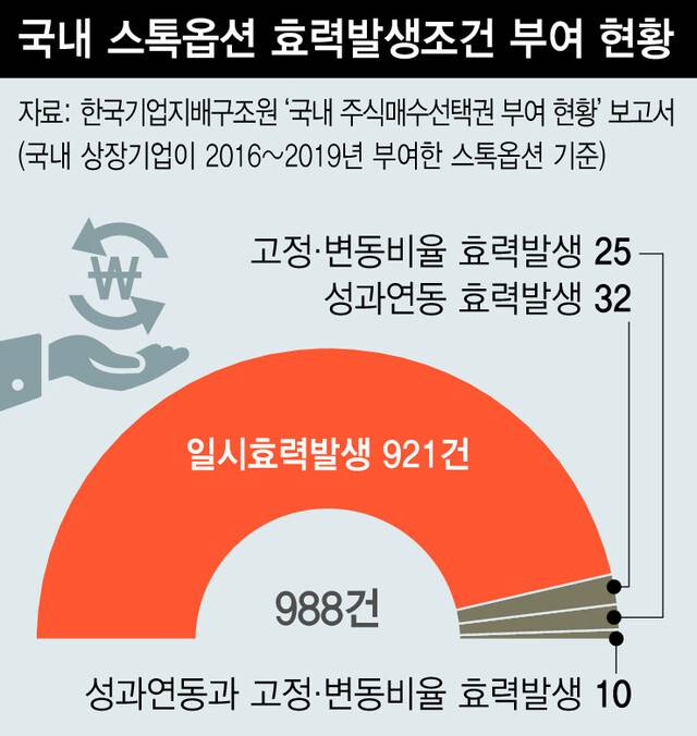 한국기업지배구조원의 ‘국내 주식매수선택권 부여 현황’ 보고서에 따르면 2016~2019년 상장기업이 부여한 스톡옵션 988건 가운데 ‘일시효력발생’이 921건(93%)에 이르렀다. 일시효력 가운데서도 의무보유 기간을 법적 최소 기준인 ‘2년’으로 설정한 스톡옵션이 563건(61%)이었다. 스톡옵션이 활성화한 미국은 2018년 기준 ‘일시효력발생’ 비중이 13%에 불과했다. 미국은 의무보유기간을 법적으로 정하지 않았지만 3년 미만으로 둔 기업은 하나도 없었다. 임자영 선임연구원은 보고서에서 “스톡옵션 시장이 활성화할수록 주주에 미치는 영향이 커진다”며 “스톡옵션에 기업가치를 장기적으로 높일 수 있도록 유도하는 행사 조건을 부여하고 조건 세부 사항을 정교하게 만들어 경영자와 주주간 이해를 일치시키기 위한 방안을 모색해야 한다”고 말했다.