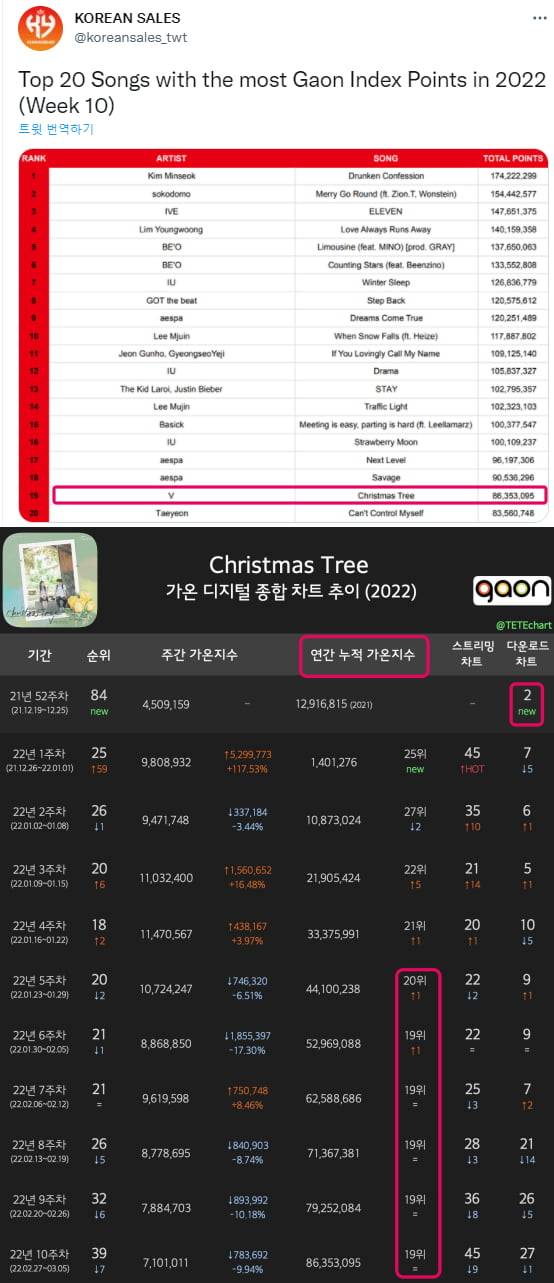 방탄소년단 뷔의 'Christmas Tree'가 가온차트에서 남자 아이돌 솔로 최고 순위를 기록했다.