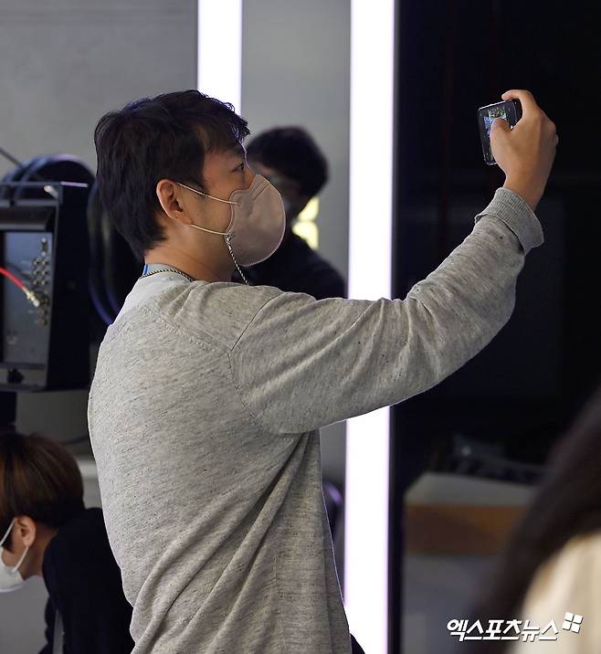 방송 준비하는 김민아 아나운서를 배경으로 셀카 인증샷을 찍는 정우영 아나운서