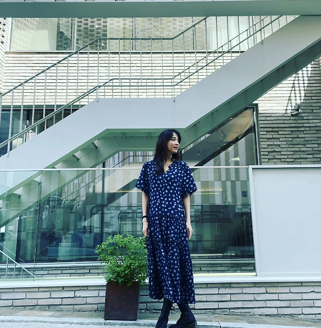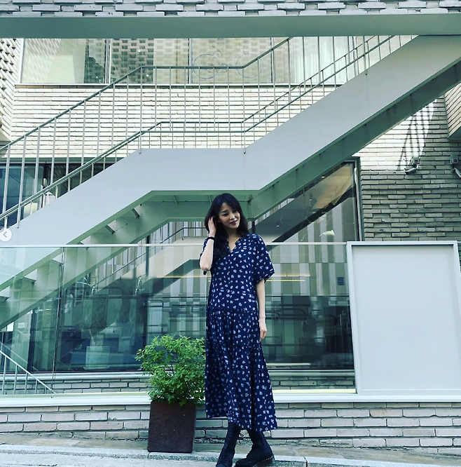 한고은은 네이비색상에 패턴이 들어간 원피스로 청순한 이미지를 돋보이게 하는 스타일링을 선보였습니다.