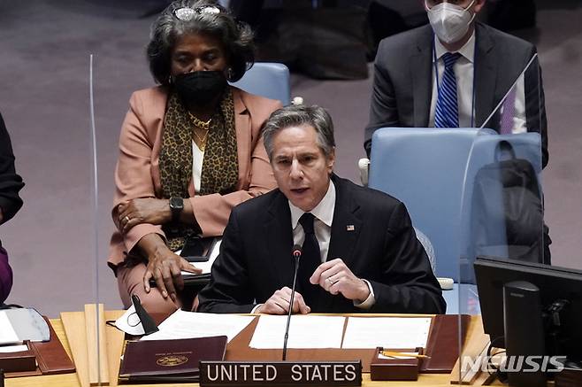 [뉴욕=AP/뉴시스] 앤서니 블링컨 미국 국무장관이 17일(현지시간) 미국 뉴욕의 유엔본부에서 열린 유엔 안전보장이사회에 참석해 우크라이나 상황과 관련해 발언하고 있다. 블링컨 장관은 "러시아는 우크라이나를 침공하지 않을 것이라고 분명하게 선언할 수 있다”라며 불가침 선언을 촉구했다. 2022.02.18.