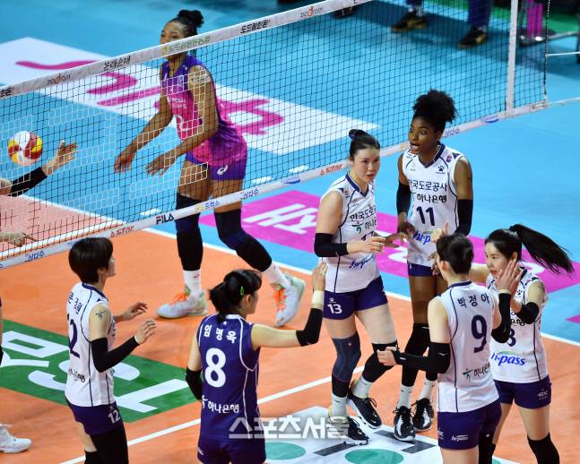 도로공사 정대영 등 선수들이 2일 삼산월드체육관에서 열린 2021-22프로배구 여자부 흥국생명과 한국도로공사의 경기에서 득점한 후 자축하고 있다.2022.01.12.