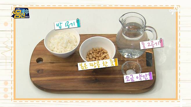 재료 : 밥(백미) 1공기, 물 2공기, 볶은 땅콩 한 줌 (약 1/3 공기), 소금 약간