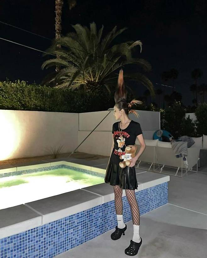 그 시절, 산다라 박의 야자수 머리는 엄청난 센세이션 그 자체였다. 오랜만에 돌아온 2NE1의 완전체 모습에서도 그 모습을 어김없이 보여줬다. 강렬한 뿔머리에 프린트 셔츠, 가죽 스커트, 망사 스타킹으로 깜찍한 펑크 룩 완성. 곰인형 모양의 가방과 크록스 펌프스로 산다라 박만의 유니크함을 더하는 것도 잊지 않았다는 거!