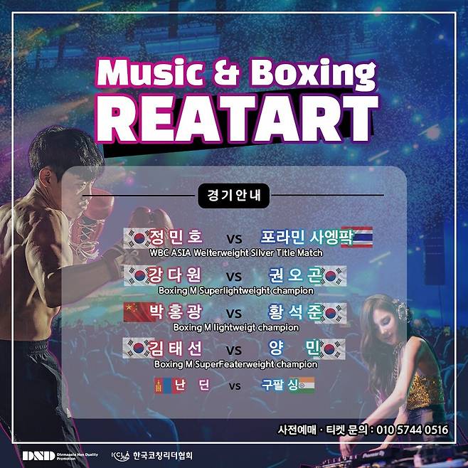 대회를 주최하는 DND프로모션 김영인 대표는 "새로운 방식의 흥행으로 복싱의 가치를 더 끌어올리고 싶다. 앞으로도 우수한 복서들에게는 계속 기회를 주고 일반인들도 복싱과 음악을 함께 즐길 수 있는 무대를 만들겠다"고 밝혔다.