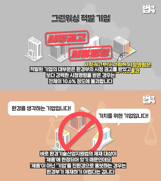 그린워싱이 적발된 기업의 대부분은 환경부의 시정권고를 받았지만, 권고가 아닌 시정명령을 받은 경우는 전체의 10% 정도라고 함,,,, (제재 대상이 '기업'이 아닌 '제품'으로 한정되어 있기 때문)