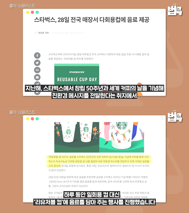 지난해, 스타벅스에서 진행했던 리유저블 컵 이벤트는 일회용 컵 대신 다회용 컵에 음료를 담아주는 행사였는데