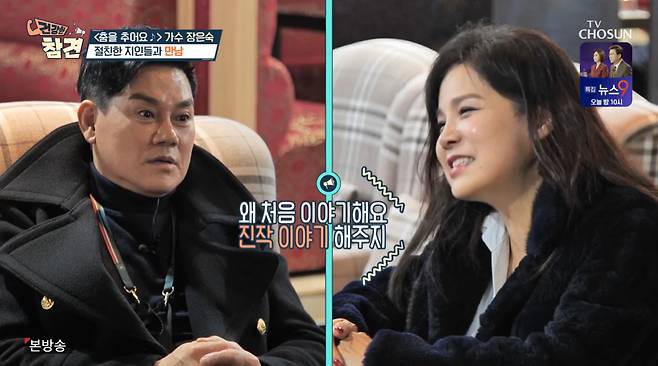 김충훈이 장은숙의 목소리를 칭찬하며 "(사람들이 장은숙의) 허스키한 목소리가 매력적이라고 한다. 내 주변 동생도 그 목소리에 빠졌다고 하더라"라고 말하자 장은숙은 "왜 처음 이야기하냐. 진작 좀 이야기 해주지"라며 아쉬워했다.