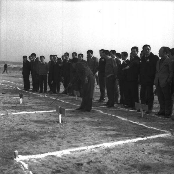 땅집고 취재에 따르면 이 사진은 1975년 서울 ‘잠실시영아파트’(현재의 ‘파크리오’) 제 2차분 기공식 때 찍힌 것이다. 서울사진아카이브 홈페이지에는 당시 기공식에 참가한 구자춘 서울시장을 비롯한 고위공직자들이 막대를 들고 바닥에 그려둔 ‘잠실시영아파트’ 평면도를 가리키는 사진이 올라와있다. 즉 분양 전 예비청약자들이 방문하는 모델하우스라기 보다는, 기공식에 방문한 사람들이 아파트 준공 후 주택 내부를 떠올려볼 수 있도록 서울시가 현장에 임시로 그려둔 그림일 것이란 해석이다.