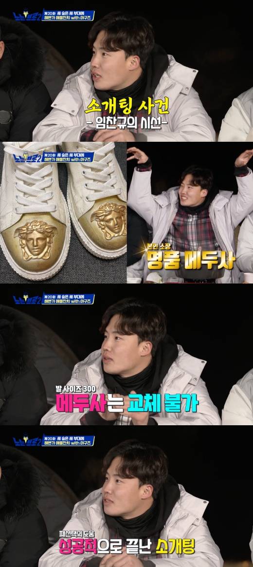 이에 임찬규는 “용택이 형한테 소개팅을 나가게 됐다고 전화를 했다. 지금 현재 착장하고 있는 옷을 한번 얘기해 보라고 하더라. 흰색 반팔 티, 검은 바지, 신발은 이만한 메두사가 뱀이 튀어나올 것처럼 그려져 있는 명품 신발이라고 설명했다”라고 입을 열었다.