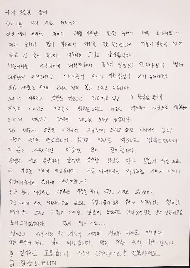 인생의 특별하고 소중한 시작을 함께하게 된 두 사람의 앞날에 따뜻한 축복과 응원을 보내주시길 부탁드립니다. 더욱 큰 책임감을 가지고 방송 안팎으로 좋은 모습 보여드리도록 노력하겠습니다.