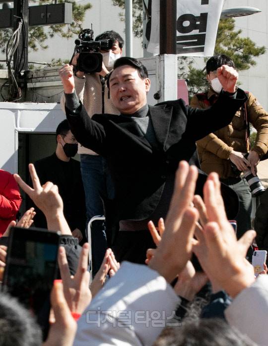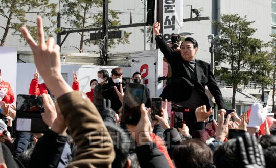국민의힘 윤석열 대선 후보가 6일 서울 중구 동대문디자인플라자 앞에서 열린 유세에서 어퍼컷 세리머니를 하고 있다.