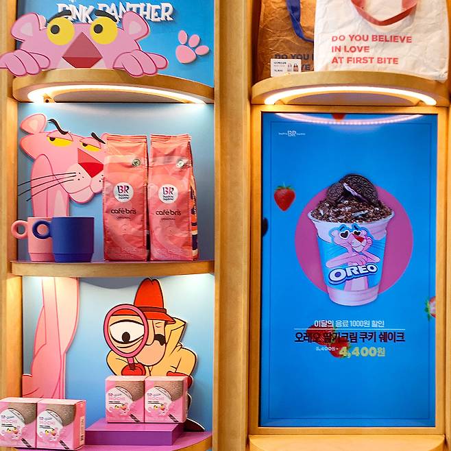 로 하려고 했으나, 매장에 도착하자마자 핑크 팬더가 유혹하는 쉐이크가 맛있어 보여서 오레오 딸기 크림 쿠키 쉐이크로 2잔 주문했어요. 쉐이크는 하나에 5,400원인데 이달의 맛이라고 1,000원 할인해서 4,400원으로 구매했답니다.
