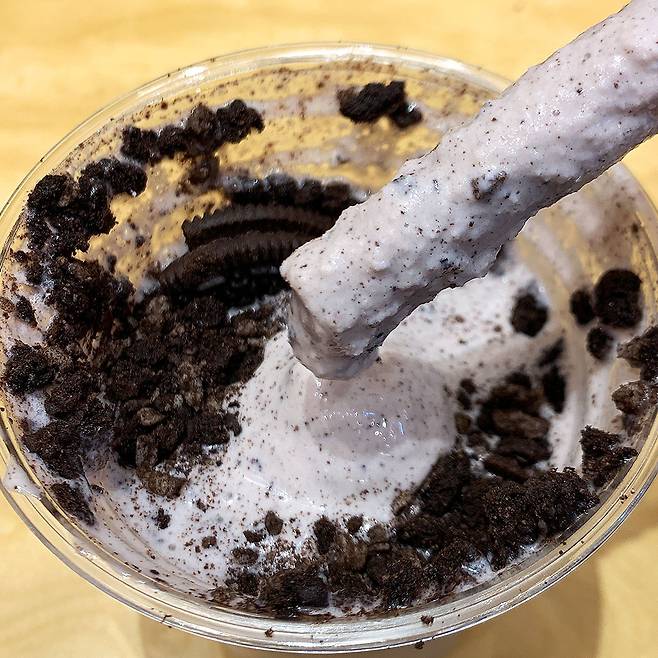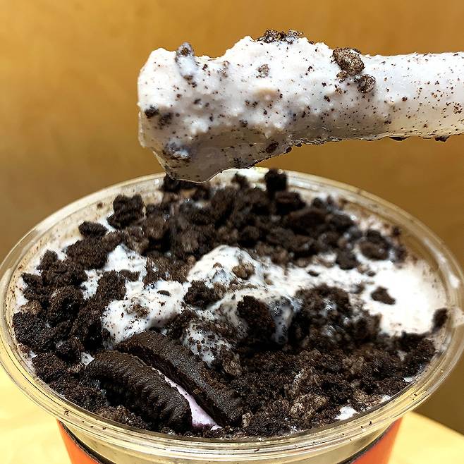 신상이라고 하기엔 너무 뻔한 맛. 이런 맛이라면 위에 올라간 오레오 쿠키를 제외하고는 새로운 맛으로 느껴지지 않아서 좀 의아했어요. 딸기맛이 더 많이 나면 좋을 것 같은데.. 저는 차라리 다른 맛을 먹을 것 같네요ㅠ