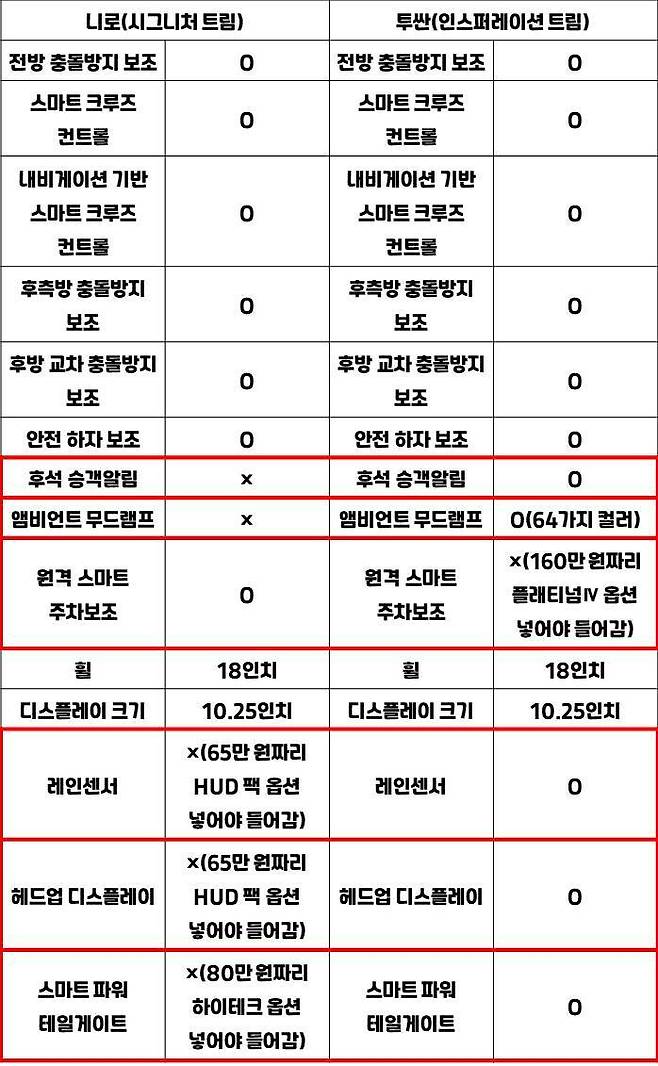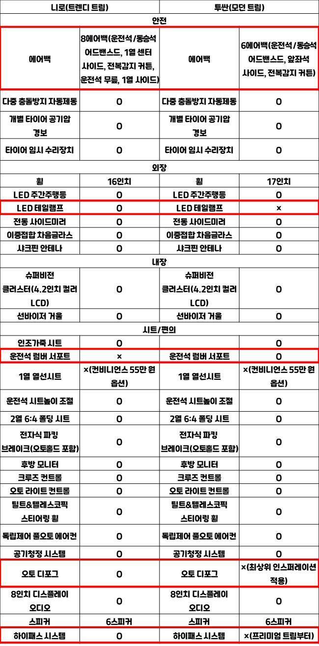 우선 가장 기본 트림을 비교해봤다. 거의 대부분의 기본 사양이 같은데, 차이가 있는 부분은 5가지였다. 먼저 에어백 개수는 니로의 승리다. 니로 8개, 투싼 6개로 아랫급 차종인데 더 많다. 특히 니로는 1열 센터 사이드 에어백, 운전석 무릎 에어백을 갖춘 점이 눈에 띈다.