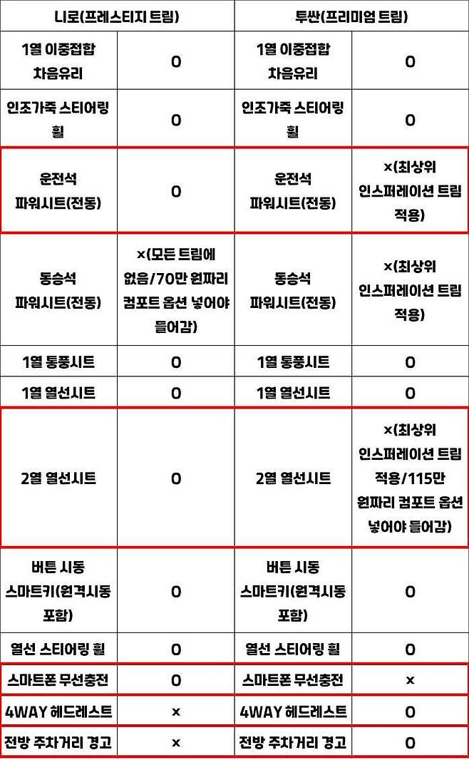 소비자가 가장 많이 선택할 중간 트림도 세부 사양이 조금 다르다. 우선 운전석 파워시트의 경우, 니로는 중간 트림부터 기본으로 들어가는 반면, 투싼은 최상위 인스퍼레이션 트림에만 들어간다. 대신 동승석 파워시트는 투싼에만 들어가며, 니로는 최상위 모델에도 빠졌다. 70만 원짜리 컴포트 옵션을 넣어야 동승석에도 전동 조절 기능이 들어간다.