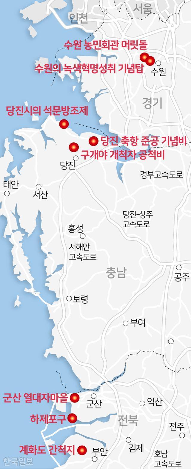 충청남도 당진 북부에는 오도와 구지도라는 섬이 있었다. 이 두 곳에는 서로 다른 성격의 기념비가 있다. 오도에는 식민지 시기에 세워진 '당진 축항 준공 기념비'가 있다. 이 비석의 뒷면에는 '인천 기선 주식회사'가 당진항 공사를 후원했음을 알리는 구절이 새겨져 있다. 그러나 그 후 오도 북쪽이 모두 매립되면서 인천과 당진항 간의 뱃길은 끊겼다. 한때 배를 이용해서 인천 등 외부 세계와 빠르고 편리하게 이어지던 오도 일대는, 뱃길이 끊기면서 교통이 불편한 벽촌이 되었다. 신흥개발회가 구지도 일대의 바다를 메워 농토로 바꾼 사실을 기념하는 '구개야 개척자 공적비'는 어촌이자 교통의 요지이던 태안반도가 한적한 농업 지역으로 바뀌었음을 증언한다.
