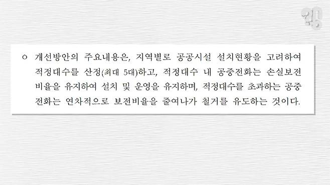 그렇지만 공중전화는 전기통신사업법에 근거를 둔 ‘보편적 역무’다. 쉽게말해 국민 누구나 언제 어떤 상황이든 비용에 구애받지 않고 전화서비스를 이용할 수 있어야 한다는 국가 의무사업으로 정해놓은 거다.